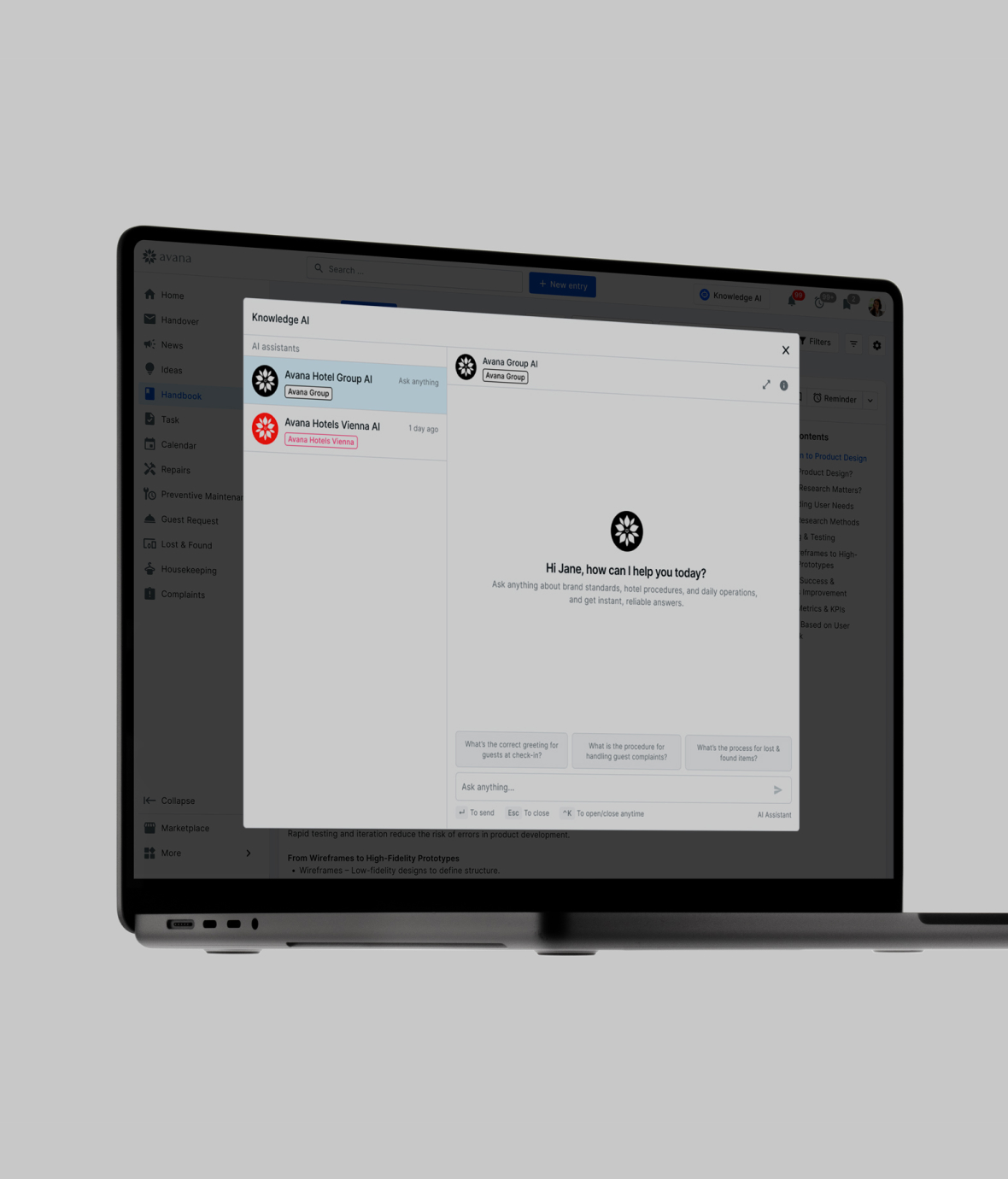 Knowledge AI helps your team find and understand hotel knowledge through simple conversations. It works like a chatbot for your digital knowledge base and provides instant answers based on your SOPs.